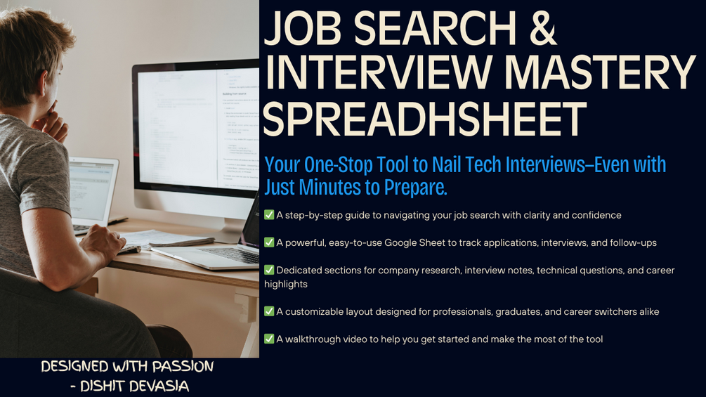 You’ll get: A step-by-step guide to navigating your job search with clarity and confidence, a powerful and easy-to-use Google Sheet to track applications, interviews, and follow-ups, dedicated sections for company research, interview notes, technical questions, and career highlights, a customizable layout designed for professionals, graduates, and career switchers alike, and a walkthrough video to help you get started and make the most of the tool.
